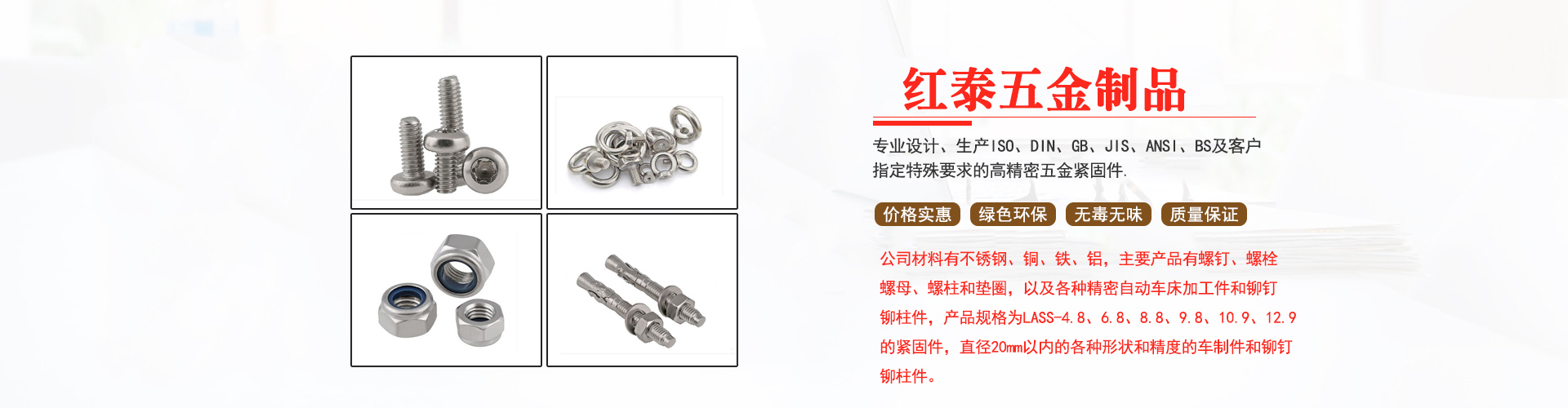 公司材料有不銹鋼、銅、鐵、鋁,主要產品有螺釘、螺栓、螺母、螺柱和墊圈,以及各種精密自動車床加工件和鉚釘鉚柱件,產品規格為LASS-4.8、6.8、8.8、9.8、10.9、12.9的緊固件,直徑20mm以內的各種形狀和精度的車制件和鉚釘鉚柱件。